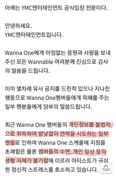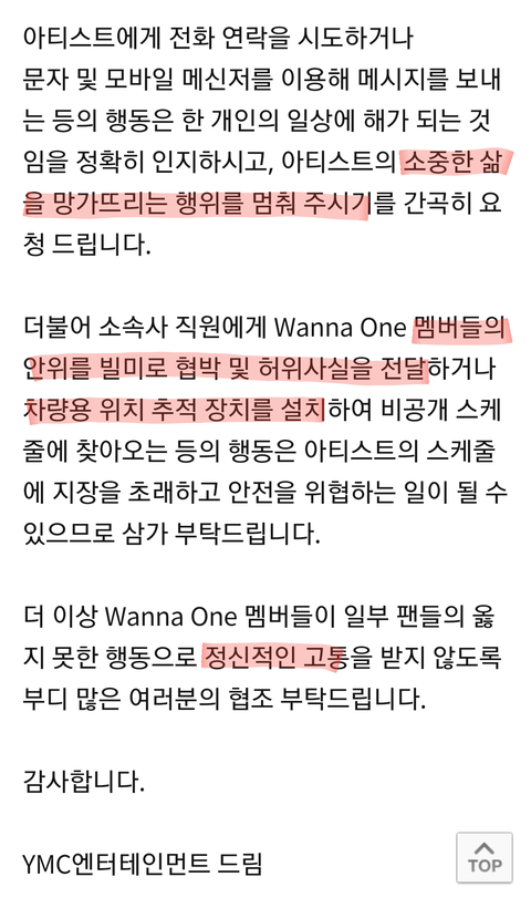 <워너원 측, "사생팬들 멤버 개인정보 불법 취득… 소속사 직원 향한 협박까지">