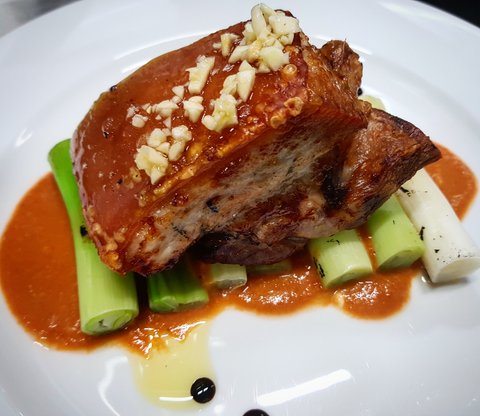통삼겹오븐 구이와 스페인식 로메스코소스를 베이스로한 응용 소스& 대파구이