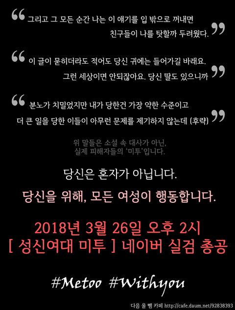 미투운동이 변질되어간다며 되레 비난을 받고있는 상황속에서도, 어디선가 누군가의 성희롱 혹은 성폭행으로 인해 씻을 수 없는 고통과 트라우마를 겪고 있을 또 다른 피해자들을 위한 운동입니다.