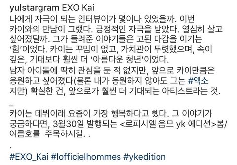 인터뷰 한 분의 진솔한 후기가 인스타에 올라왔음. 카이는 언제나 그렇지만 반드시 동종업계 함께 일한 사람들에게 평가가 일관되게 매우 좋음. 진정성 성실함이 있는 카이의 모습에 모두가 호감을 갖는 듯.