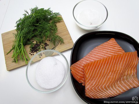 횟감용 연어와 소금, 설탕. 그리고 향신료가 준비물의 전부입니다.
