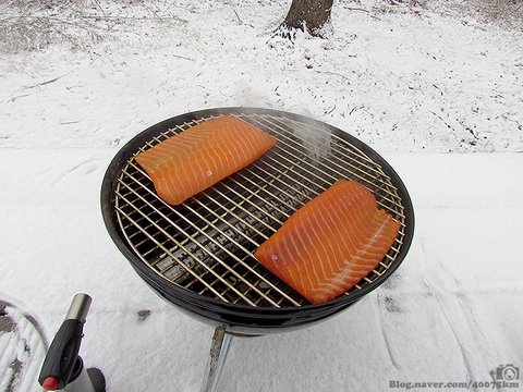 따라서 이번처럼 바람도 불지 않는 3월의 어느 날, 폭설이 내리며 그릴의 온도를 차갑게 식혀주는 날씨야말로 연어를 훈제하기 가장 좋은 날입니다. 뚜껑을 얹고 공기구멍을 살짝 열어놓으면 그 위로 연기가 솔솔 피어나옵니다. 부뚜막에 밥 짓는 연기 올라오는 풍경을 보며 느끼는 흐뭇함이 이런 걸까요.