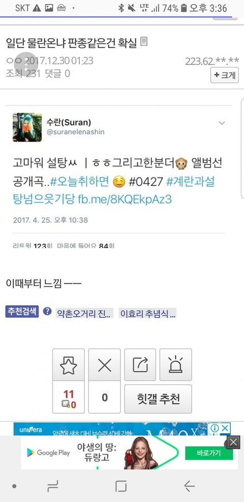 나 아민데 저게 럽스타든 아니든 수란 진짜 실망임... 슈가랑 수란이랑 연애하면 별 타격도 없을 것 같고 오히려 축하해 줄 수 있는데 저런 식의 인스타는 뭐하자는 거지? 가만히 있던 슈가는 뭐가 됨? 럽스타가 아니라 해도 저건 무슨 관종같은 짓임? 근데 너도 참 정성스런 관종이다ㅋㅋㅋ 저거 멜론에서 슈가가 프로듀싱해서 받은 핫트렌드상인데 베스트 커플상ㅋㅋㅋㅋㅋㅋㅋ 겁나 웃기노ㅋㅋㅋㅋ