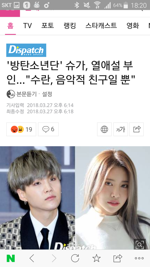 열애설이면 기사로 터져야지 주기적이었던 것도 아니고 꼴랑 오늘 하나 그것도 여자 한쪽에서만 올라온 인스타 갖고 궁예질 해놓은 주제에 열애설이라니 ㅋㅋㅋㅋ 침소봉대 좀 하지 마라. 그리고 슈가 수란 상 받은 건 핫트렌드상에 프로듀서 아티스트로 받은 건데 베스트커플ㅋㅋㅋㅋ상이라며 멋대로 상 이름 개조하는 건 대체 무슨 의도?