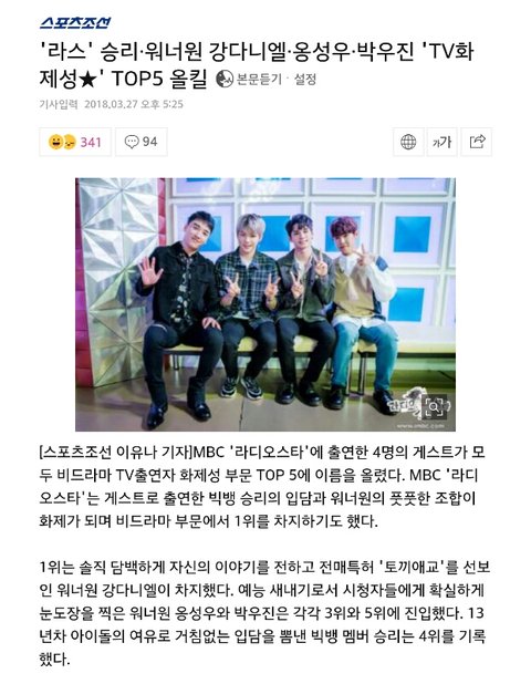 기사)'라디오스타'워너원 강다니엘 비드라마부문 TV화제성 1위