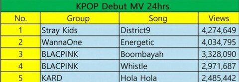역대 k-pop 데뷔 뮤직비디오 24시간 조회수 순위
