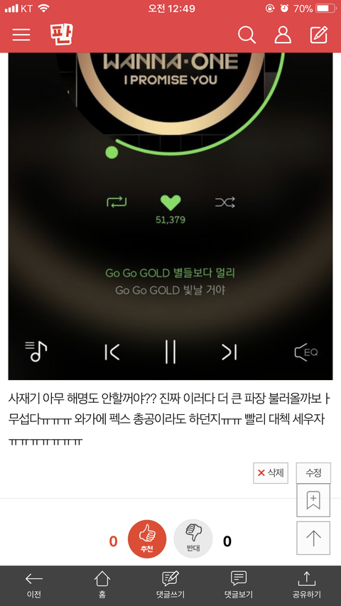 쓰니야, 팬톡에서 지금 무슨 피드백을 바라는거니? 아직 상황파악이 제대로 안된 상태잖아 지금 정확히 말 할수 있는 사람은 아무도 없어 그러니 이런글 쓰지말자