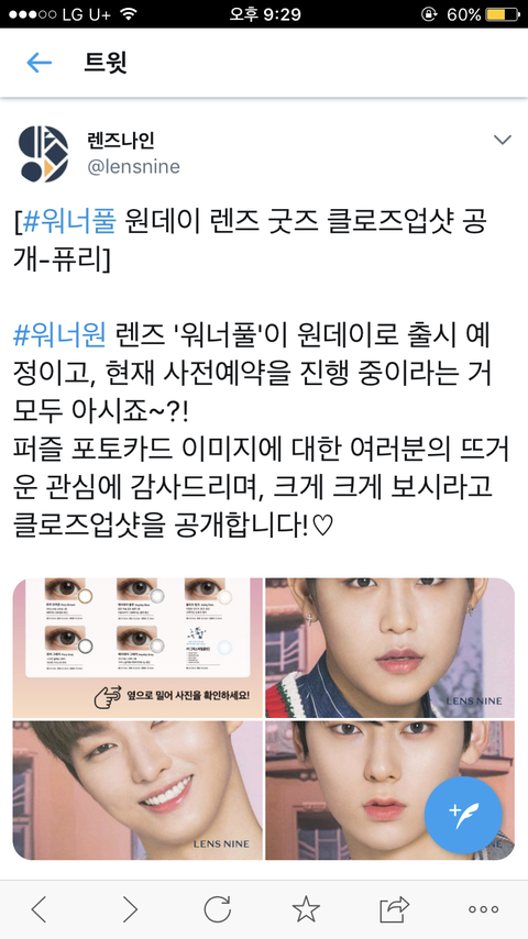 렌즈나인 황민현 클로즈업 샷