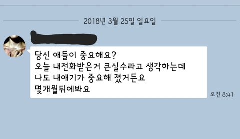 주말 아침 근무였던 저는 출근하여 일을 하던 중 모르는 사람으로 부터 니 아이가 그렇게 소중하냐? 오늘 내 전화 받은거 실수한거다. 나도 내 아이가 중요하다며 몇개월뒤에 보자는 문자를 받았습니다.