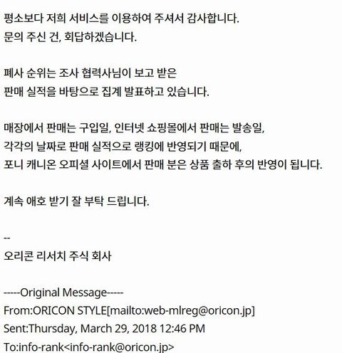 이게 오리콘에서 온 답변인데 포니캐년 사이트에서 판매되는 앨범들은 상품 출고되는날 오리콘에 반영된다고 써있음. 코리아 뮤직이 배송완료라고 했으니까 출고된날 반영되었어야 함