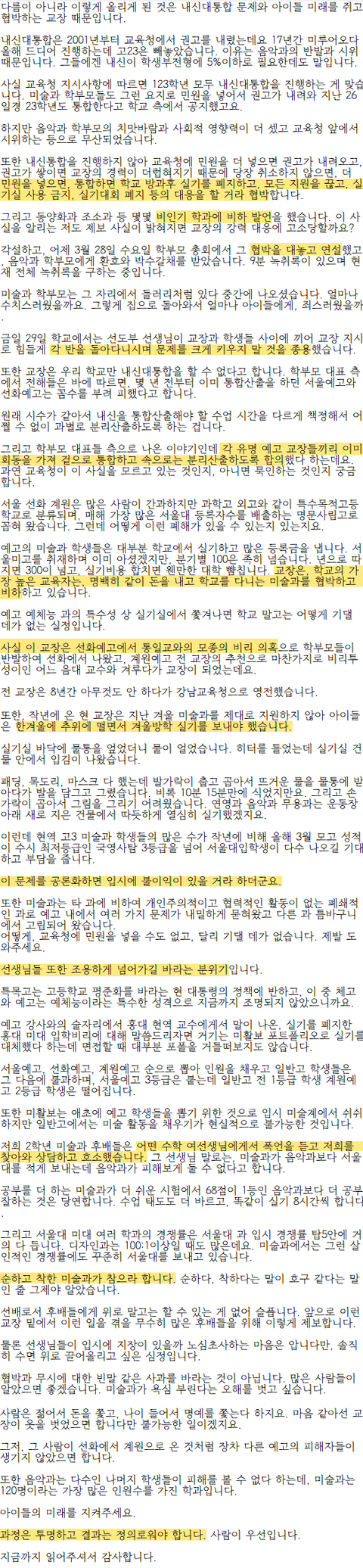 3. 음악과 학부모랑 교장이랑 단합해서(통합되면 공부못하는 음악과에 불리함), 현재 교장 및 선생들이 미술과 학생들에게 입닥치고 있으라는 폭언, 협박 실시간 진행중 (+현 교장 비리가 어마무시하다고 함)