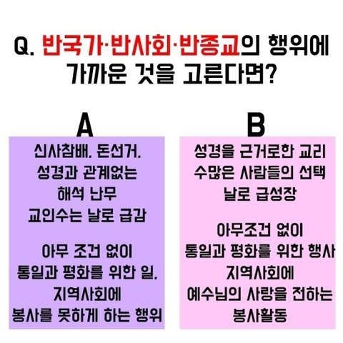신천지에 빠진 사람들 A, B 중 어느 쪽이 온전한 신앙인으로 보이시는지요?