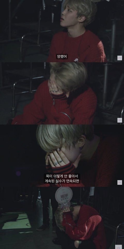 뭐 무대 실수하고 무대 뒤에서 자책하고 있는 방탄 지민이라는데 조카 팬도 아닌데 내 심장을 후벼 파버렸어....너무 안쓰럽자너...