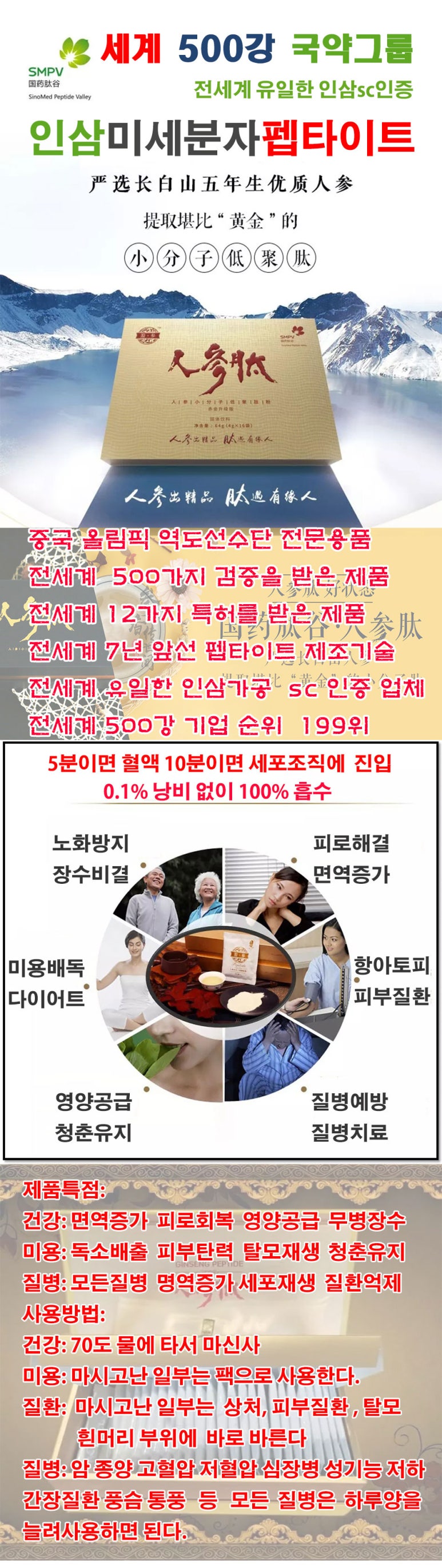 북위 41.5도인 장백산에서 재배된 5년근 이상의 인삼을 북경대학의학부는 GMP 특수 효소성 분해를 통하여 인삼의 모든 활성성분을 100% 적출하는 획기적인 기술로 전세계 유일한 인삼펩타이드 SC인증을 획득하고 무농약잔류 무중금속검증과 스위스 SGS188검증을 통과하고 북경대학의학부 24종의 과학논증을 통하여 12가지 국제특허를 받은 안전한 제품이다.
