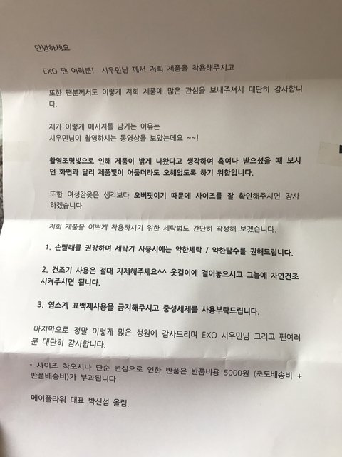 파자마회사에서 시우민팬들에게 편지까지 써주심