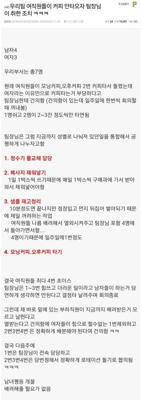 동일 능력입니까? 궂은 일, 힘 쓰는 일은 남자시키면서커피를 타라고 말하는 상사의 말은 성차별입니까?창고 정리, 재고 정리, 고장난 복사기 고치는 일, 복사 용지 채우는 일은남자 시키면서 커피 타는 일은 여자가 꼭 해야 합니까?셋째로, 경력단절 문제입니다. 여자여서 임신해서 경력단절 온다.우리나라 출산율 1.03명입니다. 애 안 낳으시잖아요 여러분은.결혼도 하면 미친 짓, 애 가지면 멍청한 년 프레임 씌우시잖아요?경력단절 외치시는 분들, 애 안 가지실 거잖아요?왜 본인은 안할 거면서 경력단절 온다고 거짓말합니까?