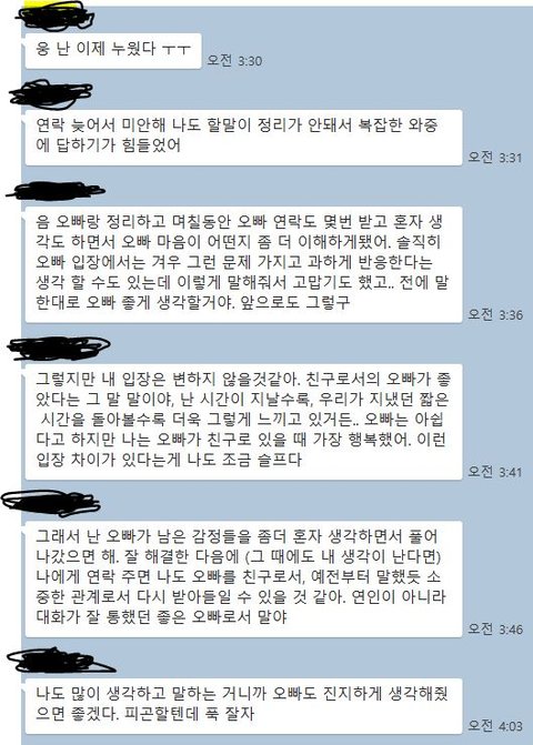 저도 어쩔 수 없구나 싶어 받아들여보겠다고 했고 돌아오는 길에 장문으로 마지막으로 하고싶었던 말들을 길게 보냈습니다. (고마웠다 미안했다 등등) (이후 여자친구가 sns다시 팔로우함)