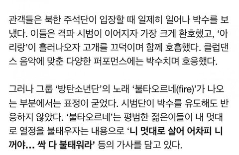 불타에 맞춰 정작 시범보였던 태권도 단장님은 인터뷰에서 격파나 '춤출때' 반응 좋았다고 했음. 뉴스 보니 기자들은 공연에 들어가지도 못했다는데 그냥 전달받은 영상보고 추측하듯 기사쓴것 같음.