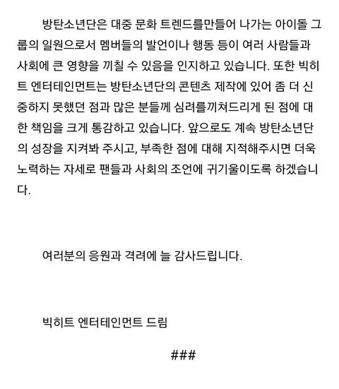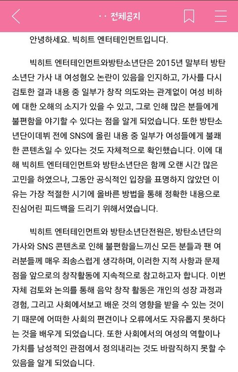 현재 톡선에 베댓에도 대댓으로 달린, 빅히트 엔터테인먼트에서 공식적으로 작성한 이 때까지 방탄소년단의 여성혐오에 대한 피드백이야. 톡선에도 올라온 정수리 트윗을 포함해서 이 시기 전까지의 것들은 우선적으로 이 공지를 통해서 피드백을 했어.