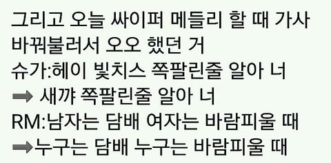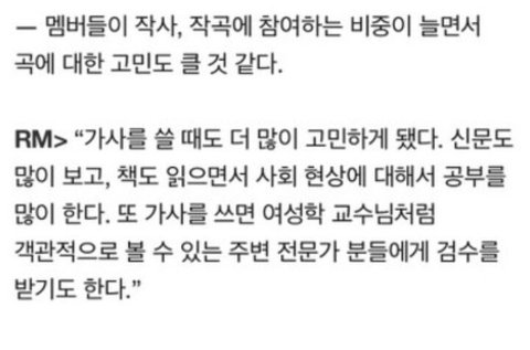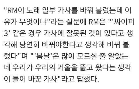 그리고 이건 작년 12월에 했던 WINGS THE FINAL 콘서트에서 여성혐오적 내용이 담긴 가사를 수정해서 부른 내역과 그에 대한 RM의 인터뷰야.