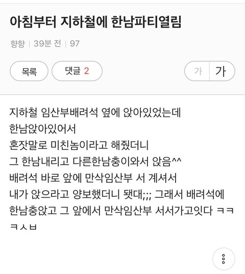 뭐지??임산부도 없는상황에 임산부좌석 앉아있다고 미친놈이라고 욕한건 뭐지?? 내가 이해력이 딸리나? 그리고 그사람 내리고 딴사람이 앉아있는상황에 임산부 온것같은데 뒷사람은 좀 거시기 하긴하다..내가 지하철 안타본지 20년 넘어서 잘모르겠는데 배려석 이라는건 말그대로 배려 아냐? 도덕적으로 해주면 좋고 안해줘도 그만인거?? 두번째 탄 양반이 도덕심이 없겠지..생판 첨보는 사람한테 미친놈이라 욕하는것도 개념이 없는거고..