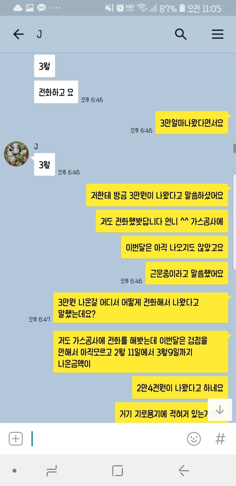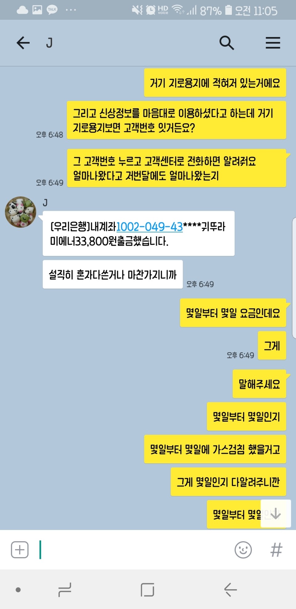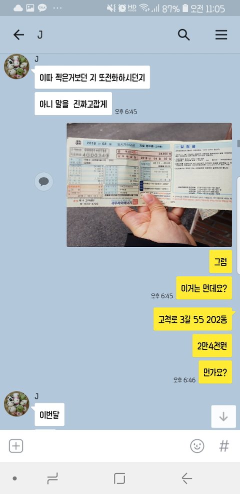 카톡내용을 보시면 아시겠지만 말을 바꾸시면서 처음에는 저에게 3개월간 정지한 연체된 요금이라고 말씀하시더니 갑자기 말을 바꾸시면서 핸드폰 침수가(핸드폰을 물에 빠뜨리신건 맞습니다.)되어서 잘못저장된걸 저에게 보냈다고 말씀을 하시더군요 그리고 제가 지로용지를 보여주고 귀뚜라미 상담센터에서 상담한 말씀을 말씀드리는 그때서야저에게 도시가스를 너무 터무없이 쓰는 것 같아 같이 살던 친구에게 부탁해서 도시가스가 제일 많이 나왔었던 요금을 보내달라고 해서 저에게 그만큼을 청구하셨다고 합니다.