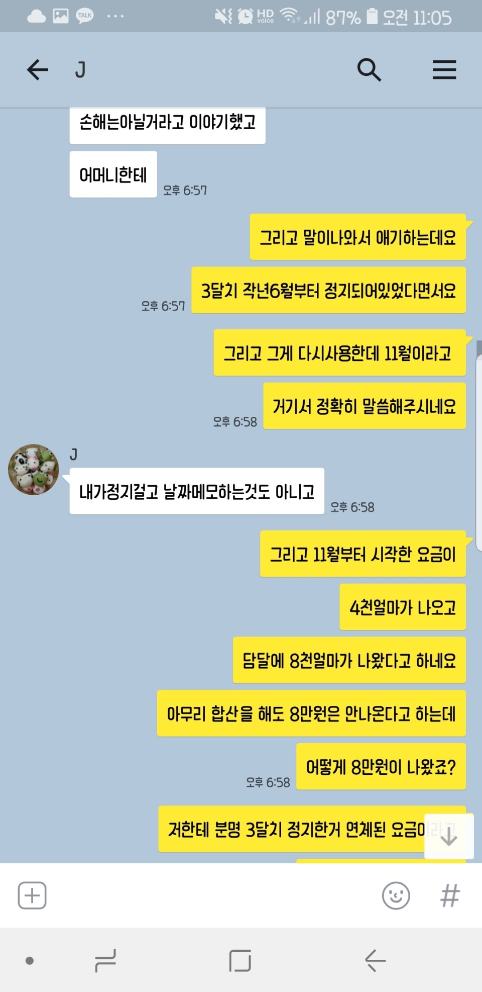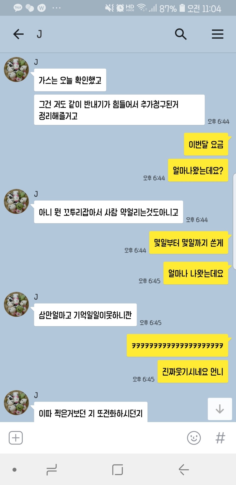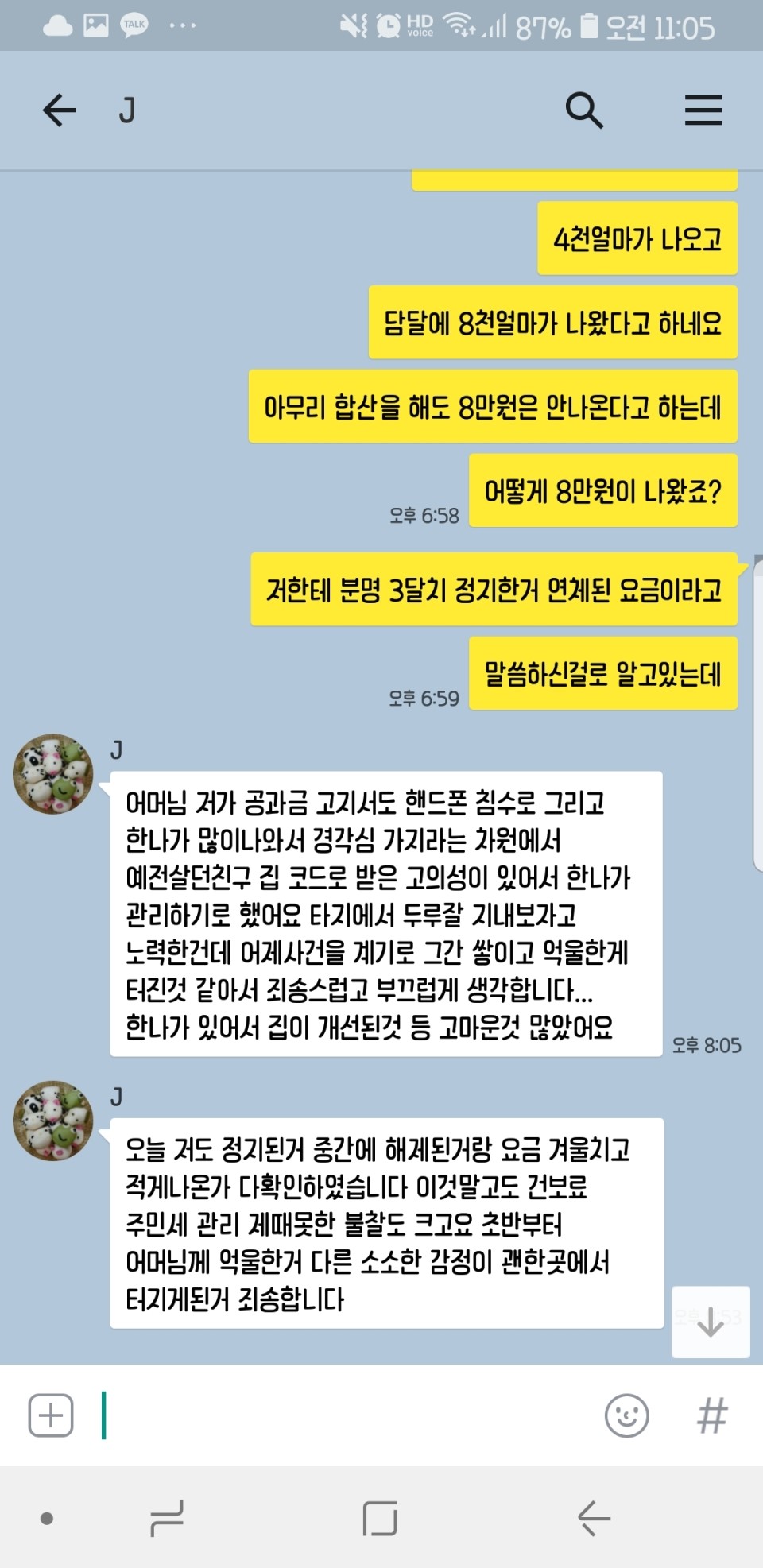 카톡내용을 보시면 아시겠지만 말을 바꾸시면서 처음에는 저에게 3개월간 정지한 연체된 요금이라고 말씀하시더니 갑자기 말을 바꾸시면서 핸드폰 침수가(핸드폰을 물에 빠뜨리신건 맞습니다.)되어서 잘못저장된걸 저에게 보냈다고 말씀을 하시더군요 그리고 제가 지로용지를 보여주고 귀뚜라미 상담센터에서 상담한 말씀을 말씀드리는 그때서야저에게 도시가스를 너무 터무없이 쓰는 것 같아 같이 살던 친구에게 부탁해서 도시가스가 제일 많이 나왔었던 요금을 보내달라고 해서 저에게 그만큼을 청구하셨다고 합니다.