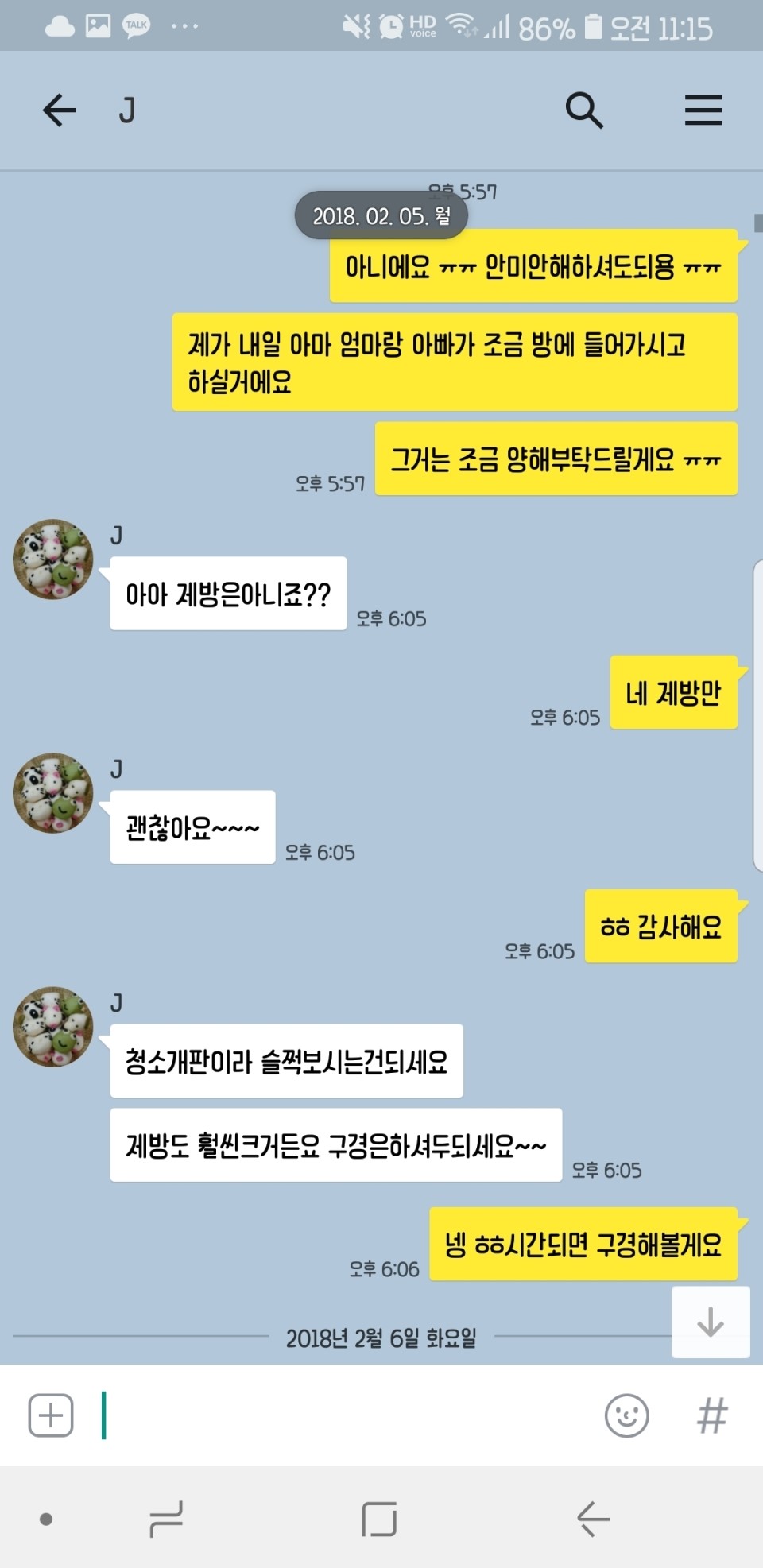 저는 2월5일에 분명 말씀을 드렸습니다. 부모님이 오셔서 이불같은 필요한 물품을 가져오실거라고 흔쾌히 승락하셨고 부모님이 방상태가 엉망이여서 방청소까지 해주셨습니다. 하메님께서 부모님이 청소한 것에대해 감사하다는 말씀은하셨다고 합니다. 하지만 이제와서 자신의 집에와서 헤집어놨다는 말씀을 하시니 정말 어처구니 없더군요