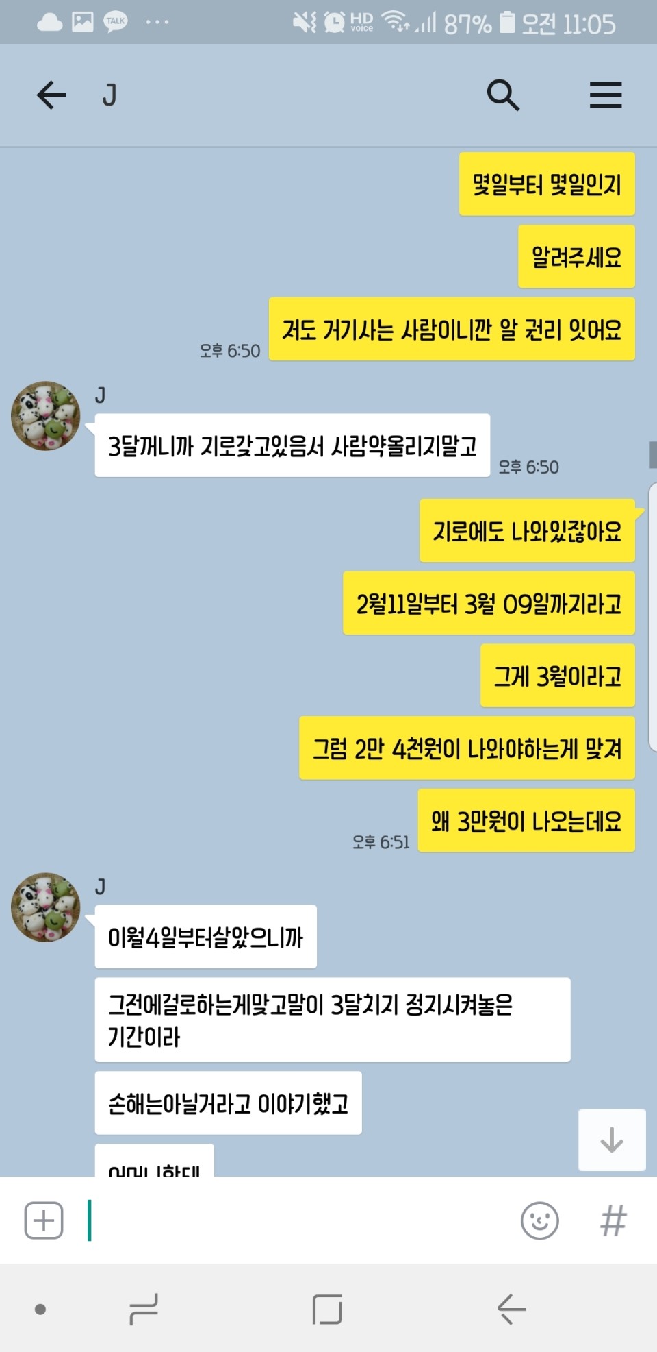 이것이외에도 저는 분명 들어올때 보증금 100/ 월세 25만원을 드렸습니다. 2월2일부터 3월1일까지의 월세였죠제가 월급이 3월5일에 들어오기 떄문에 3월5일에 4월달까지의 월세를 8만원의 공과금 반절과 다른 공과금과 함께보내드렸죠 제가 4월달에 저희언니 취업으로 인해 집을 옮기는 상황이 와서 이사를 하게되었는데 저에게 월세와공과금을 내고 나가라고 말씀하시더군요 저는 선불의 월세를 드린것을 기억이 나지않아 부모님에게 말씀드렸더니월세를 선불로 주지 않았냐? 라고 말하니 아...그랬나요? 까먹었네요 죄송합니다. 이런식으로 말씀하더군요저는 부모님이 아니였다면 아마 그하메님에게 돈을 드렸을 것입니다.