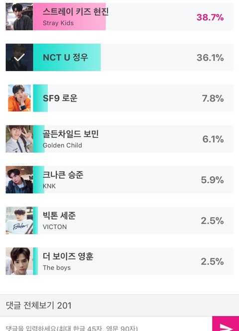 아이돌ㅊㅍ 에 투표하는게 나왔는데 정우가 2등을 하고 있어 ㅠㅠ 근소한 차이니까 한번씩만 투표 눌러주라