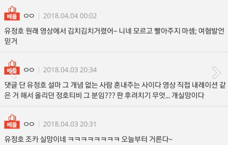 "야 내가 판에서봤는데~ 유정호 그x끼 여자들한테 김치김치거리면서여혐하고다닌데~