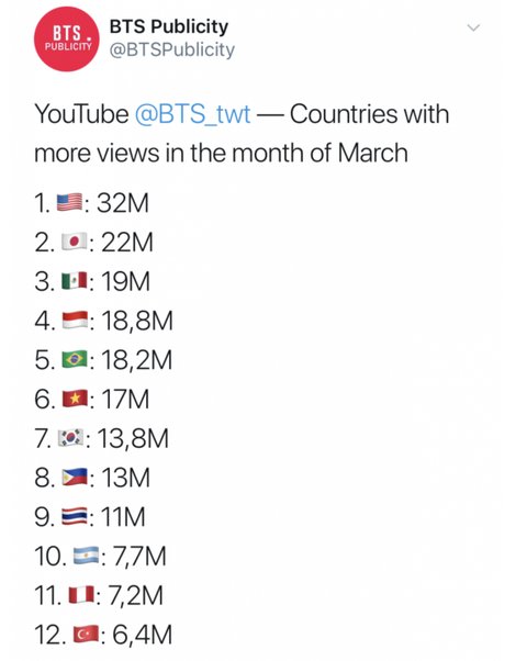 ✅ 방탄소년단 너튭 많이 보는 나라순 ✅
