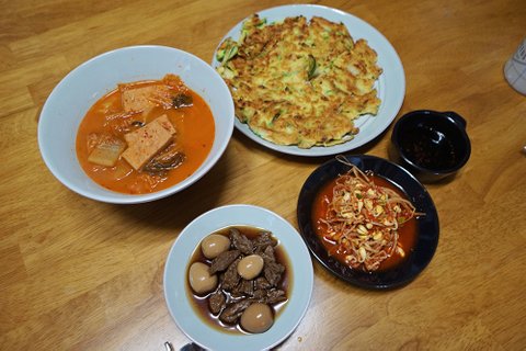 4. 부대찌개 + 장조림 + 콩나물무침 - 내가한요리 / 호박전 - 남편요리