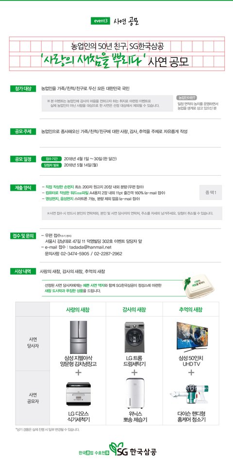 사연공모이게 메인인데, 농업인으로 종사하고 있는 친구/가족/지인 등에 대한 사연 공모하면 당사자와 공모자 둘다 대박 경품이~