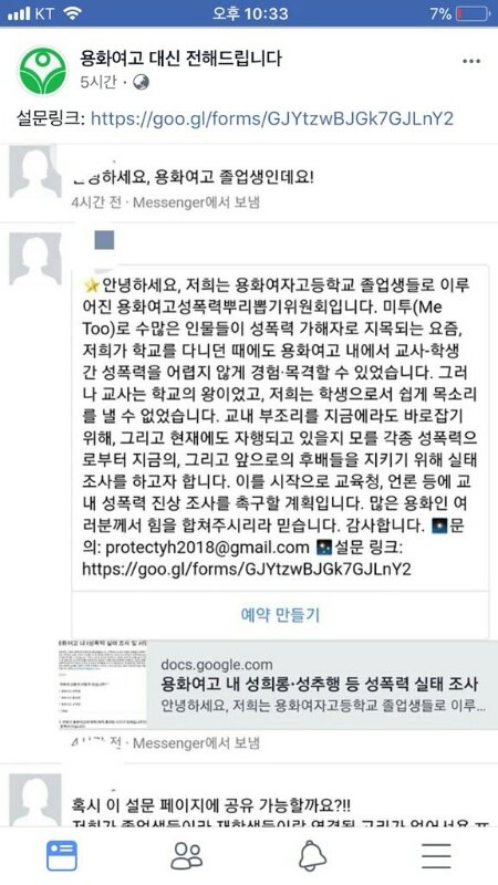 3월 15일, 졸업생 분들이 용화여고성폭력뿌리뽑기위원회를 조직하여 페이스북 페이지에 실태조사 설문조사를 올린 것이 시작이었습니다.