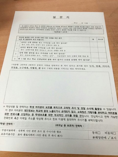 오늘 아침 시간에는 서울시교육청 측에서 설문지를 작성하게 하였습니다.