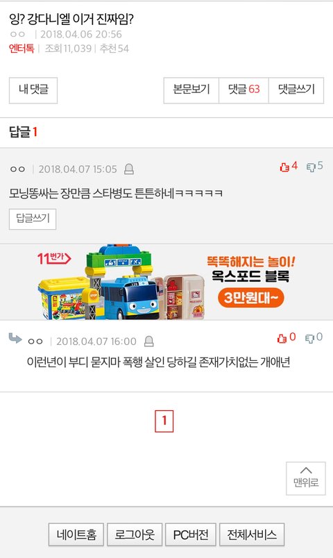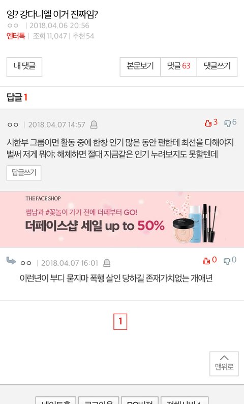 댓글 보다가 너무 놀라서 소름 끼침... 아무리 지오빠 욕하는거 화나도 그렇지 같은 여자한테 살인당하라니 말이 너무 심한거 아니야? 강다니엘 망신 다 시키지 말고 정신차려