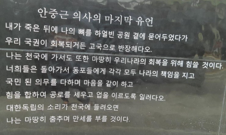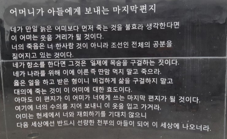 안중근 의사의 마지막 유언과 아들에게 쓴 어머니의 편지글은 차마 그 마음의 경지가 이 작은 가슴으로 담기가 벅차올랐습니다.