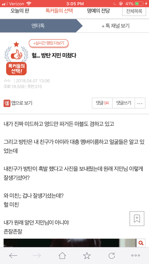 지민이 글 상위랭킹이고 새 컴백 떡밥 알리는 글이라 머글들도 많이 볼 듯 싶은데 이렇게 베플이 대놓고 방탄 까는글이면 머글들도 어라 얘네 욕해도 되는건가 해서 여론 안 좋아질듯