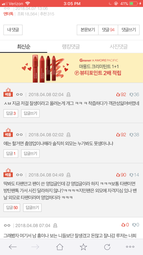 지금 내가 본 게 5분만에 추천수가 조작 베플만 몇십개 올라가더니 원래 베플을 갈아엎었어