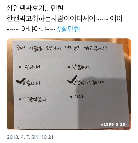 그 와중에 포스트잇 보고 ‘한캔 먹고 취하는 사람이 어디써어어~~~ 아냐아ㅑ~~~’ 이랬다는거에 발림