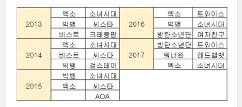 년도별 인기많거나 영향력있는?? 아이돌그룹이라는데 근 5~6년간 남돌여돌 다들어감ㅋㅋㅋㅋ13년도 전에 소시는 꾸준히 있었을테고.. 작년에는 3그룹이나 들어갔고 ㅋㅋㅋ하긴 13년도 전에 슈주샤이니동방신기신화등 다 인기많았으니까 다 잇었겠당