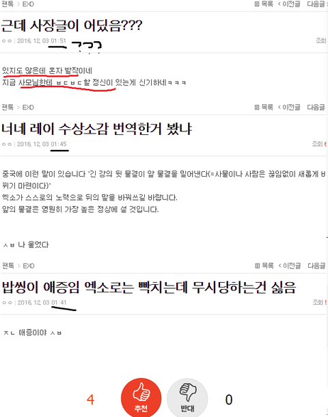 ++++ 예언 틀림 이글 올라오고 잠깐 닥쳤다가 바로 저녁에 애들 물어뜯으면서 세훈이 까글 베톡조작함ㅋㅋㅋㅋ 원래 라창패턴이 "조용해진거보니까 역시 다 누구줌짓" 이러면서 8명 다 돌려까는게 패턴인데ㅋㅋㅋㅋ 레이만 그런게 없었음ㅋㅋㅋ