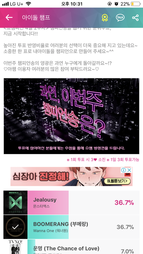 정보)b즈돌 투표 현재 4위