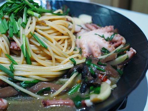 다음날, 남은 능이와 남은 낙지, 남은 부추를 넣고 능이파스타를 만들어보았습니다. 처음 해보는거지만 국물이 자작한게 능이향도 좋고 아주 맛있습니다.