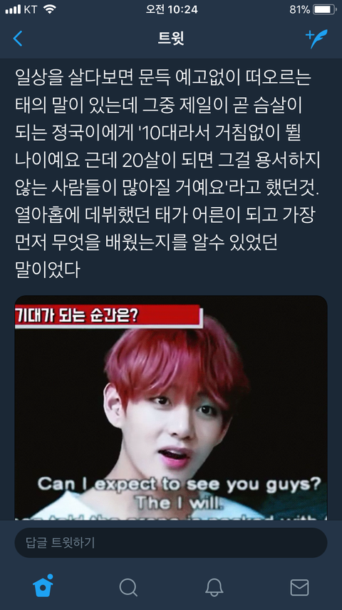 우리 태태 상처받을 일 너무 많았지. 근데 인간은 항상 빛나는 것을 시기질투하더라고. 태형이가 그만큼 멋있는 사람이라, 못난 사람들이 고깝게 보는거라는거 알아줬음 좋겠다 태형아 넌 그런 당치도 않은 야유보다 더 가치 있는 사람이야❤️