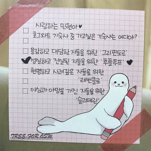 저번 팬싸때 ㅎㄹㅍㅌ 기숙사 선택에서 후플선택한 포스트잇이야!