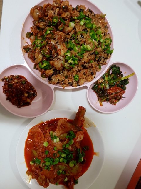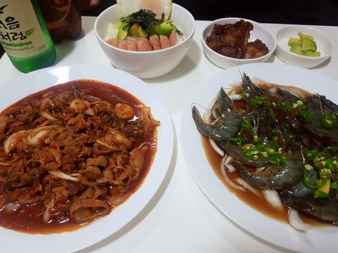 간장새우장과 대패삼겹으로만든 두루치기 그리고 명란+아보카도 비빔밥이에요.