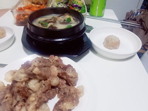 이날 귀찮았는지 사진을 발로 찍었네요. 차돌박이 굽고 표고버섯 넣어 진하게 우려낸 만둣국이에요. 옆에 골뱅이 무침도 있는데 잘 안보이네요ㅋㅋㅋ 고기 별로 안좋아하는데.... 그 말이 무색할 만큼 고기를 자주 먹게되네요