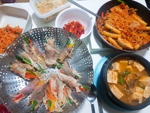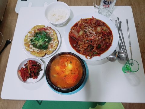 오징어볶음이랑 순두부찌개 그리고 일본분이 선물해주신 믹스로 만든 오꼬노미야끼에요.